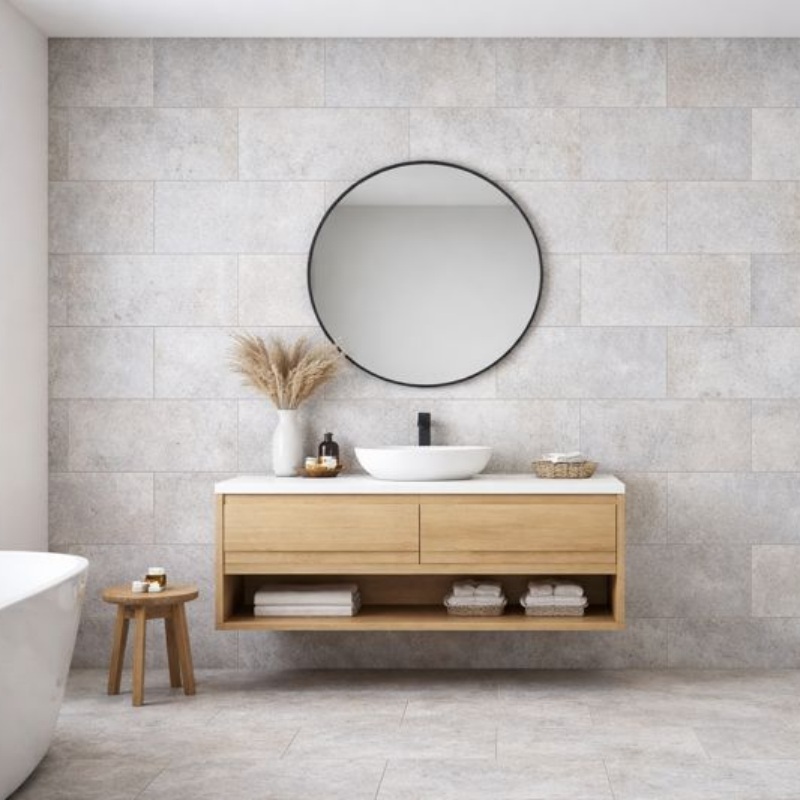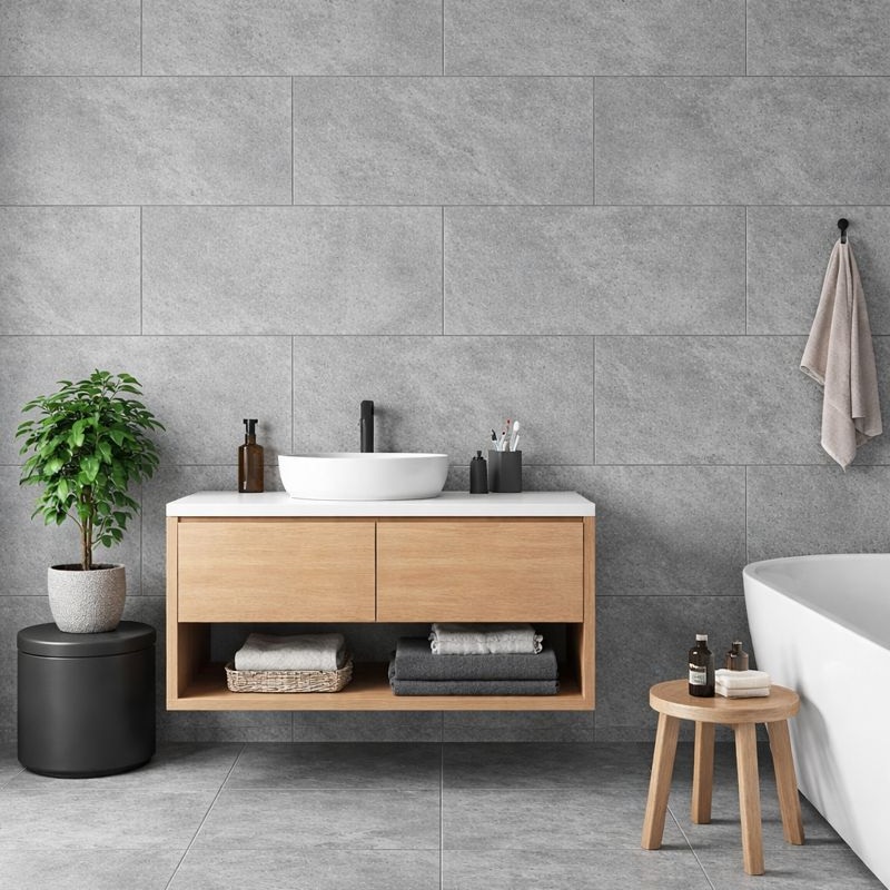 El gris neutro combina bien en cocinas, baños y zonas de paredes decorativas. Combina fácilmente con elementos inspirados en madera, metal o piedra. Esto facilita la coordinación del diseño de interiores.