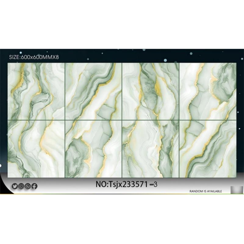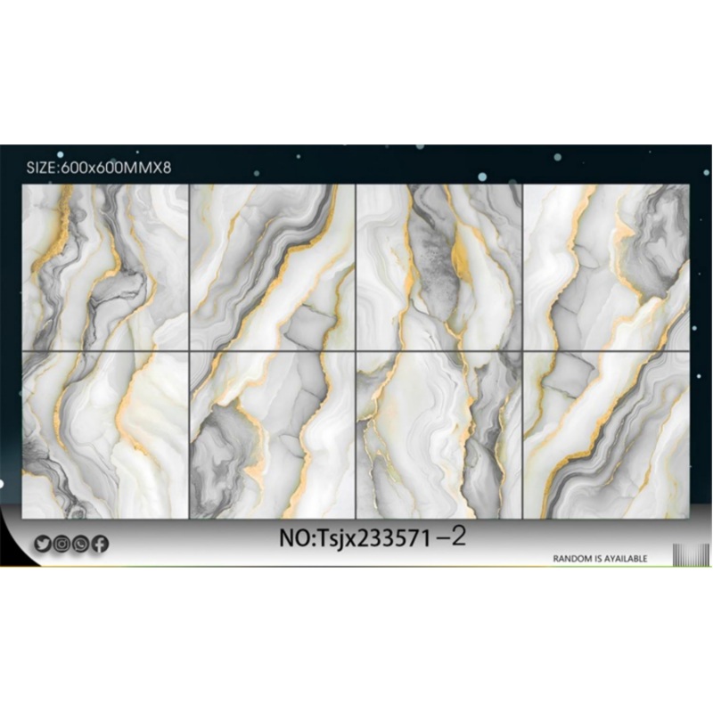 La textura efecto mármol, combinada con detalles de vetas doradas, realza la profundidad visual. La superficie pulida mejora la reflexión de la luz y la luminosidad general del espacio. Ayuda a crear un ambiente interior refinado y moderno.