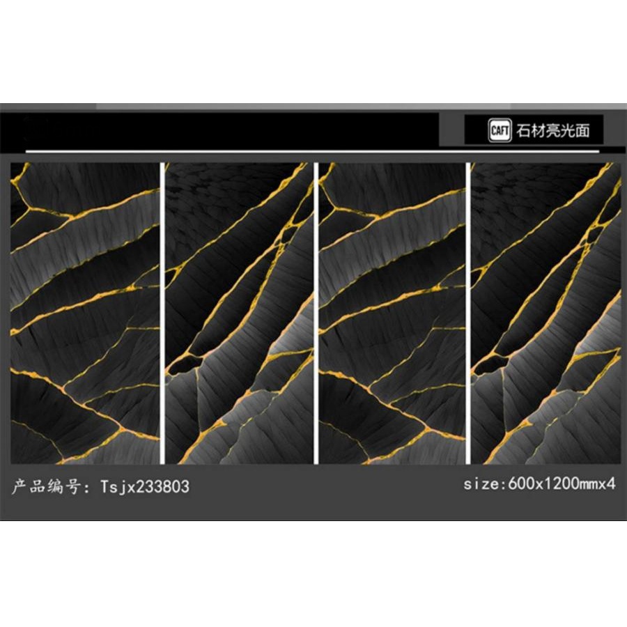 La superficie brillante proporciona un brillo y una suavidad uniformes en cada pieza. El patrón efecto mármol con detalles de vetas doradas se imprime uniformemente para lograr una apariencia equilibrada. Esto ayuda a mantener resultados uniformes en instalaciones a gran escala.