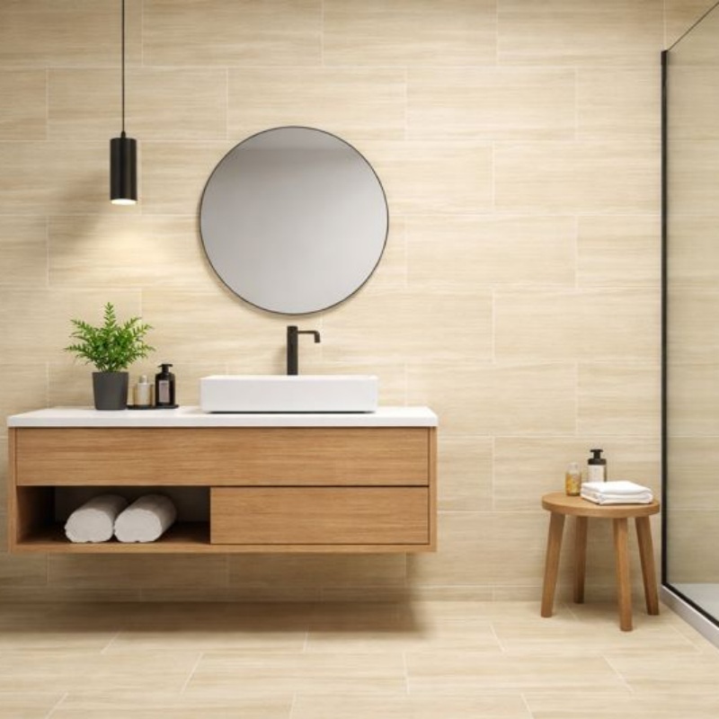 Este azulejo cerámico presenta una superficie mate con tonos claros, creando un efecto visual limpio y confortable en paredes interiores. Está especialmente diseñado para baños y ambientes con tendencia a la humedad, ayudando a reducir el deslumbramiento, mejorar la estabilidad de la superficie y mantener una apariencia fresca. Se utiliza ampliamente en baños, aseos, hoteles, apartamentos y proyectos de renovación residencial.