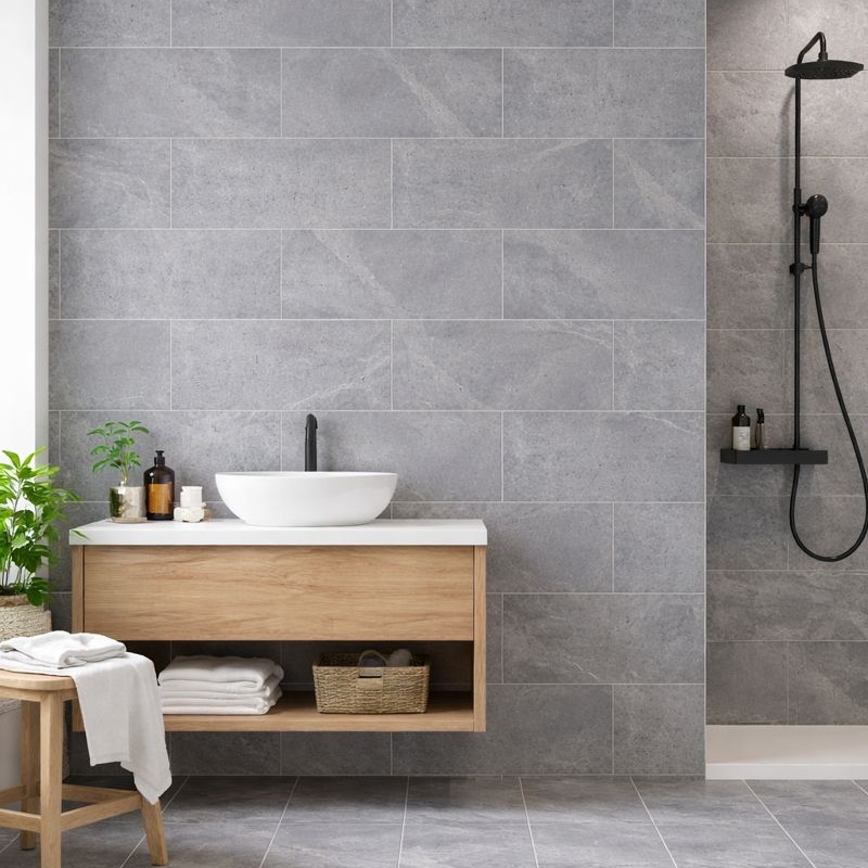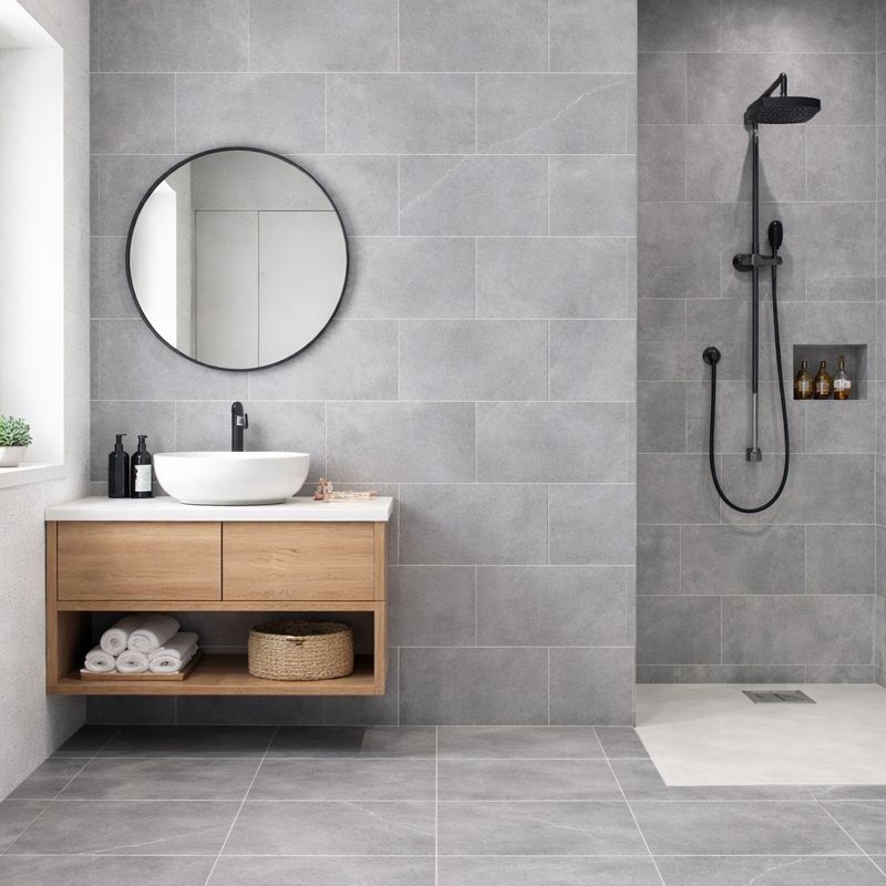 La superficie gris mate, inspirada en la piedra, ofrece una apariencia uniforme y equilibrada en diferentes lotes. Esta consistencia es fundamental para paredes grandes donde la continuidad visual es crucial. Ayuda a que los proyectos mantengan un acabado limpio y profesional.