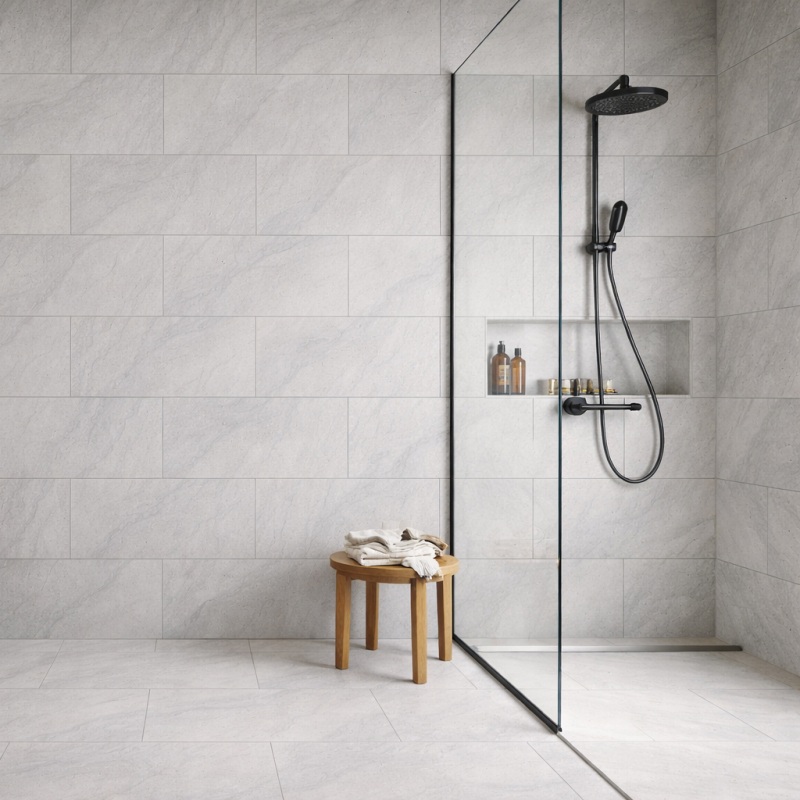 La superficie de las baldosas se adapta bien a entornos con contacto frecuente con el agua. Ayuda a limitar las marcas de agua visibles y los residuos superficiales. Esto favorece la limpieza duradera de las paredes en baños y aseos.
