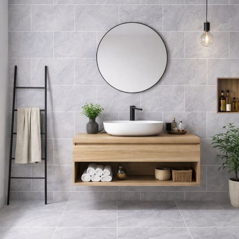 El acabado mate ayuda a reducir los reflejos no deseados bajo la iluminación del baño. Mantiene una apariencia uniforme incluso después de un uso prolongado en espacios húmedos. Esto facilita el mantenimiento diario y la gestión visual para los usuarios del proyecto.